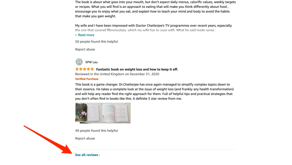 Once there, you’ll be taken to the dedicated review page for this book. Look in the upper left-hand corner, and you’ll see a search box. You can type various keywords that will provide you with more insights into what people looking to lose weight want out of a weight loss product.